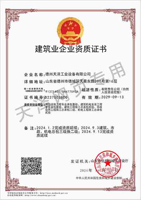 德州天澤工業(yè)設(shè)備有限公司成立于2003年(前身為德州天元集團(tuán)天明工業(yè)設(shè)備安裝公司),經(jīng)過20多年的發(fā)展,現(xiàn)成長為擁有職工600余人,各類專業(yè)技術(shù)人員近300余人,年生產(chǎn)能力兩億元以上,以建筑機(jī)電安裝工程、消防設(shè)施安裝工程施工為主,集建筑工程施工、市政工程施工、建筑智能化工程施工、園林綠化工程施工、工程管理服務(wù)、物業(yè)管理、電氣機(jī)械設(shè)備銷售等多元化經(jīng)營于一體的綜合型企業(yè)。2005年,企業(yè)按照國際標(biāo)準(zhǔn)建立的質(zhì)量管理體系,通過了ISO質(zhì)量管理體系認(rèn)證、環(huán)境管理體系認(rèn)證、職業(yè)健康安全管理體系認(rèn)證。施工工程遍布山東、河北、四川、江蘇等地,最具代表性的工程有:山東省德州市百腦匯資訊廣場(chǎng)機(jī)電安裝工程、德州經(jīng)濟(jì)開發(fā)區(qū)天元大廈機(jī)電安裝工程、陵城區(qū)人民醫(yī)院機(jī)電安裝工程、德州金魯班大廈機(jī)電安裝工程、河北故城金辰小區(qū)機(jī)電安裝工程、北川地震災(zāi)后援建工程等。多年來,公司始終堅(jiān)持“以人為本,建精品工程,創(chuàng)行業(yè)品牌”的經(jīng)營理念,先后榮獲省(市)級(jí)泰山杯、天府杯、魯安杯等獎(jiǎng)項(xiàng),申報(bào)各種功法、多項(xiàng)專利。